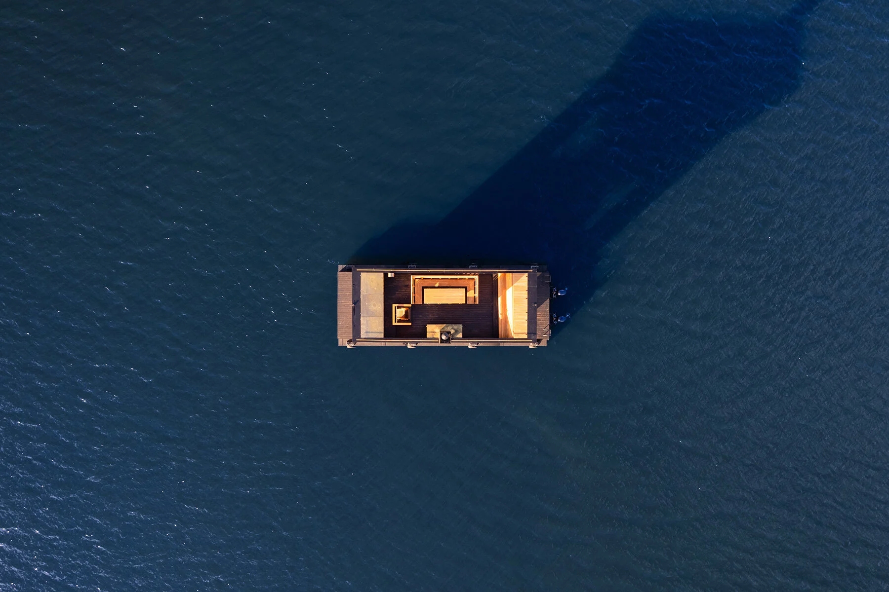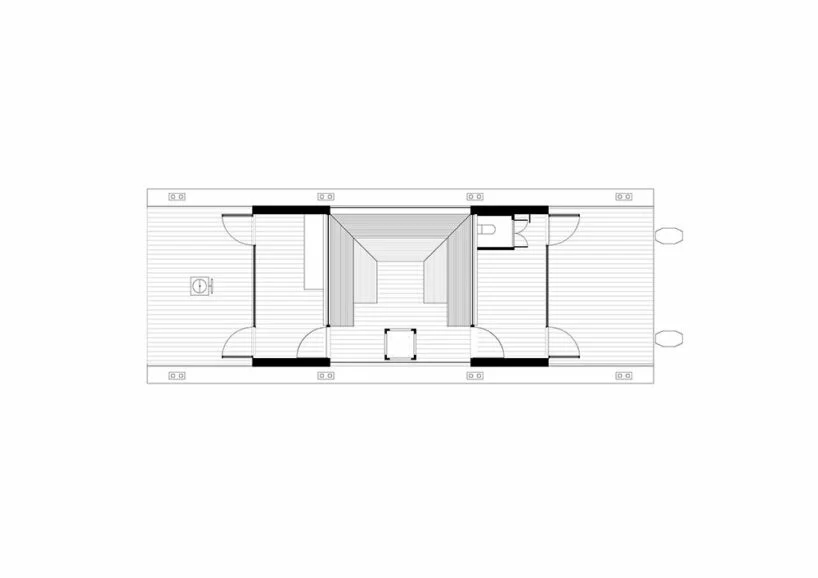 Big Branzino站在一艘雙體船的鋼製船體上,呈現出由木匠萊夫·佩爾森手工建(jiàn)造的(de)木結構。鋼製船體提供了所(suǒ)需的穩定性和儲(chǔ)存空間,使內部變得簡約而微風。牆壁和家具是由西方紅雪鬆製成的,因為它(tā)非常適合桑(sāng)拿和戶外使用(yòng)。一個木製梯子將遊客引導到上層——一個凹進的屋頂露台,上麵有一張可折疊的雪鬆桌子,當需要跳舞或日光浴時,可以將(jiāng)其收藏起(qǐ)來。